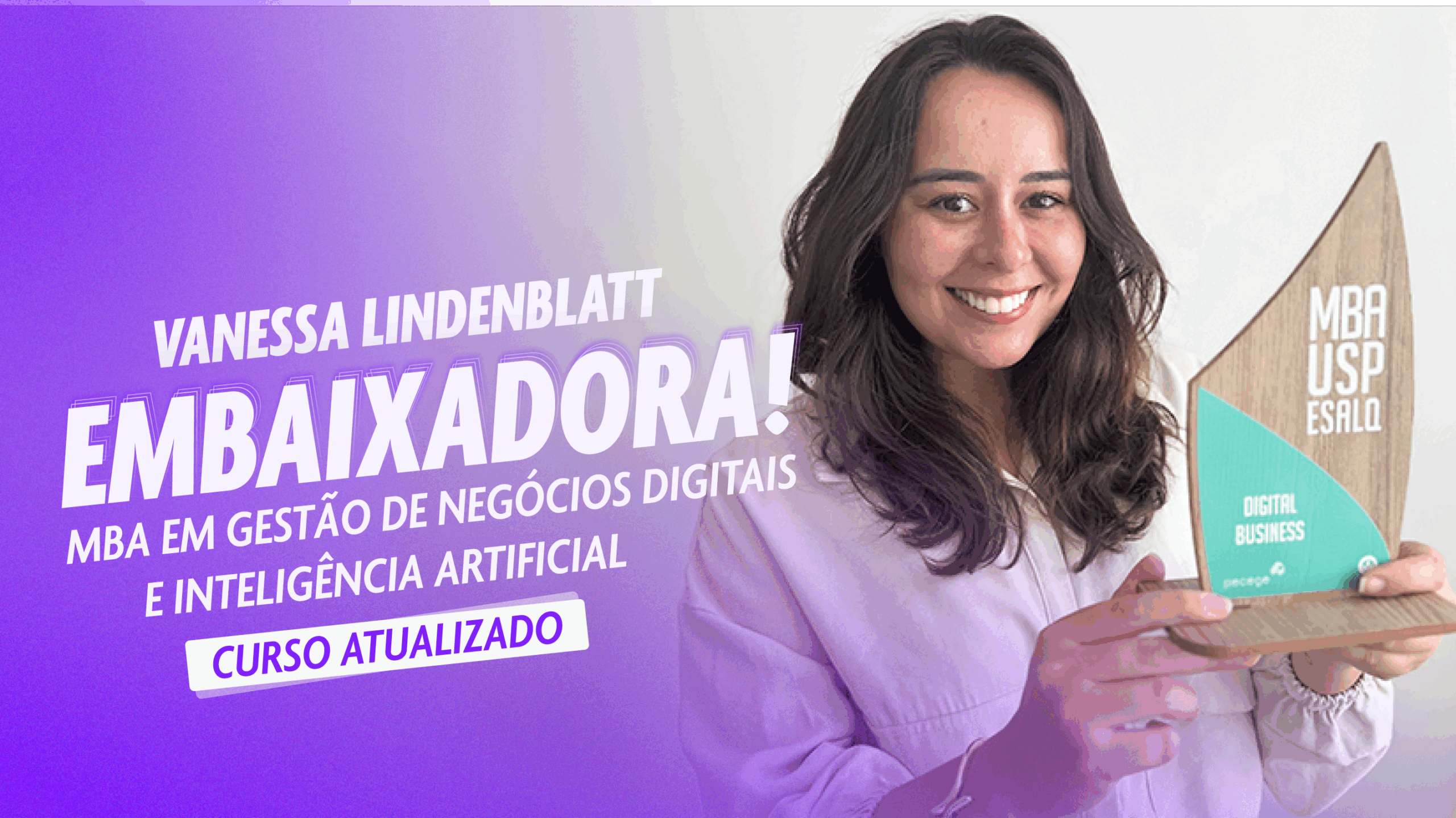 Para profissionais que atuam em áreas tradicionais e desejam migrar para o mercado de tecnologia, entender tendências digitais e adquirir habilidades aplicáveis, é essencial. Para Vanessa Lindenblatt, o MBA em Digital Business USP/Esalq, agora atualizado para MBA em Gestão de Negócios Digitais e Inteligência Artificial, foi a ponte que possibilitou sua transição de carreira. Neste artigo, você vai conhecer a trajetória da Embaixadora, motivações, aprendizados e os resultados que conquistou aplicando o conhecimento do MBA.