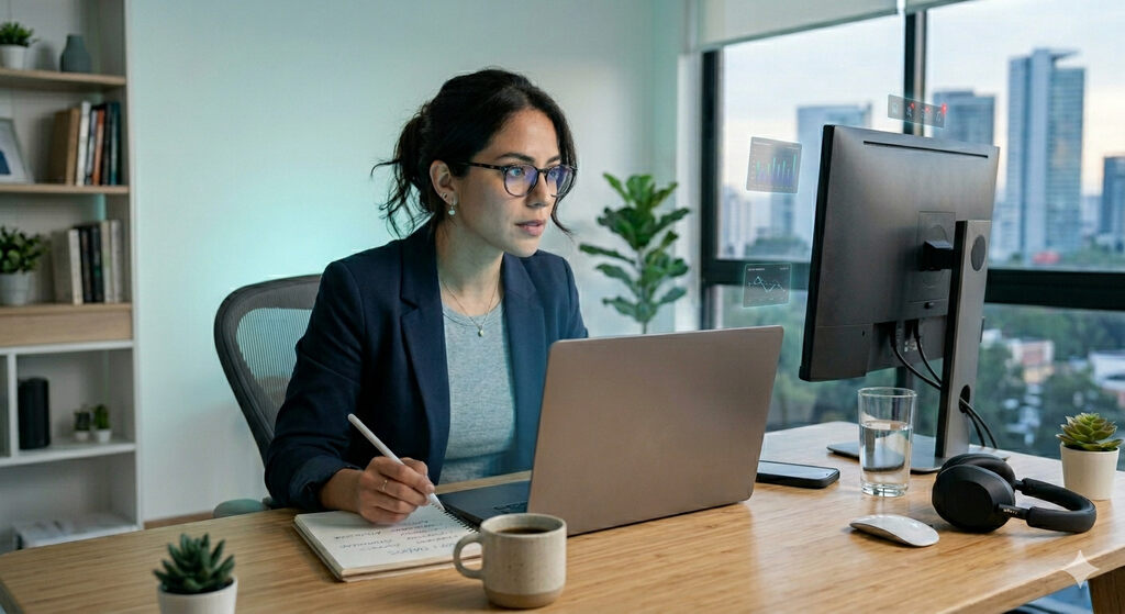 Mulher em escritório, realizando duas tarefas distintas, representando o desenvolvimento de competências digitais.